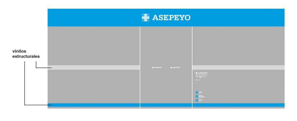 El sistema de rotulación utiliza estructuras con fondo en azul cian corporativo (equivalencia en retroiluminado Asepeyo Pantone 300 U) y el logotipo centrado en color blanco.