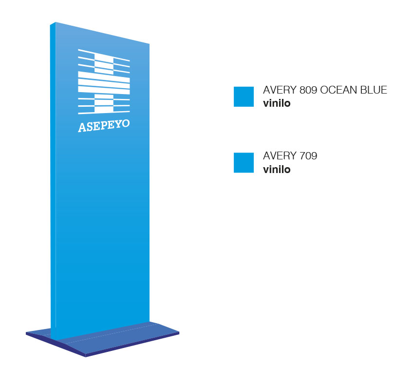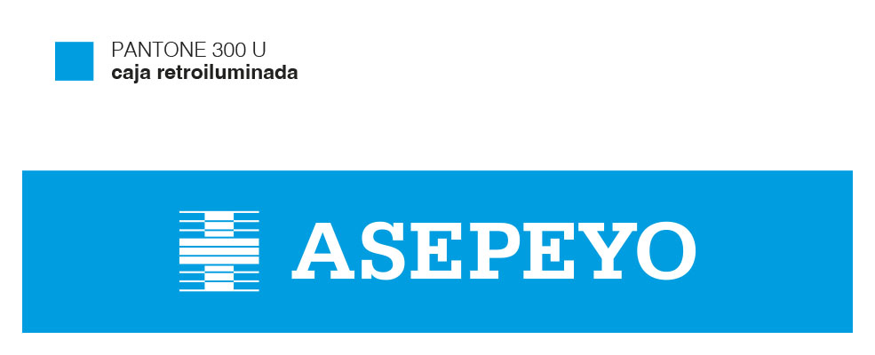 Principalmente se utilizará con fondo en color azul cian corporativo (equivalencia en vinilo: Avery 809 Ocean blue / Avery 709 / Asepeyo Pantone 300 U) y tipografía Arial, en color blanco. O viceversa.